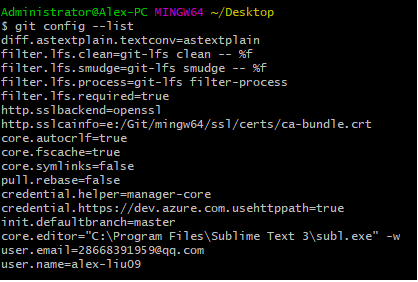 设置完成后,能够经过输入:git config —list,来检验 用户名 和 邮箱 是否设置成功,以下图所示: