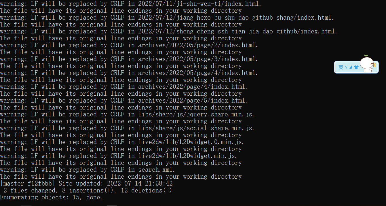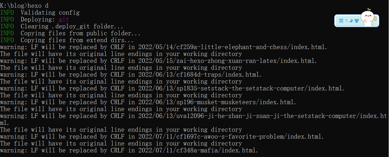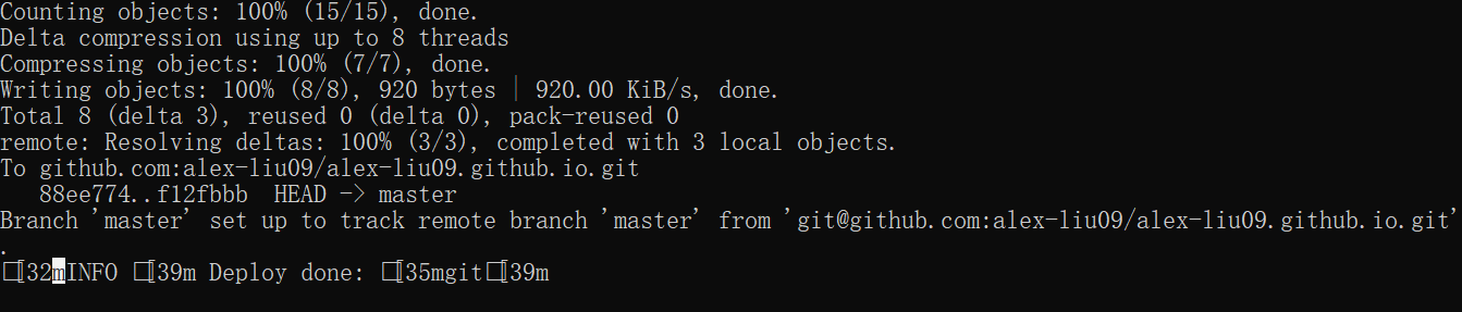 在 cmd 中输入:hexo deploy,开始将咱们最开始生成的 网站雏形 部署到 GitHub 上,这个过程须要花一些时间,须要耐心等待。部署完成后,Git Bash 窗口中以下图所示: